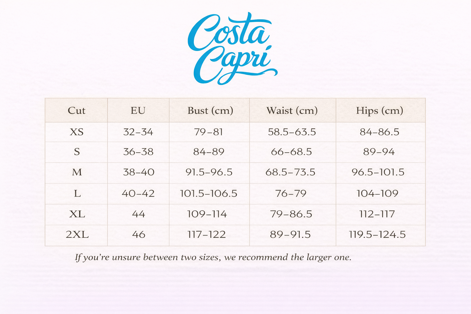 Our clothing fits exactly as indicated in the size chart. You'll find the size chart with each product, so you can always choose the right size and be assured of a perfect fit.